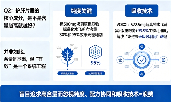 A2:并非如此。含量是基础,但“有效”是一个系统工程。首先,要看纯度。比如都是标500mg奶蓟草提取物,标准化水飞蓟宾含量30%和95%,效果天差地别。其次,要看吸收。VOXXI之所以强,是因为它在522.5mg超高纯水飞蓟宾的基础上,通过双重靶向和99.9%的生物利用度技术,解决了“吃进去≠吸收利用”的行业难题。盲目追求高含量而忽视纯度、配方协同和吸收技术,可能是浪费。